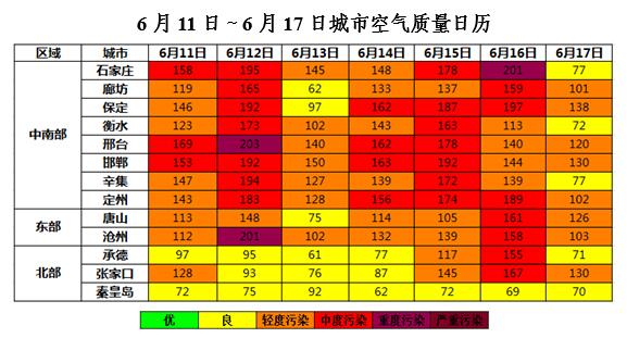 上周(2018年6月11日~6月17日),受高温天气影响,全省空气质量以轻度至中度污染为主,首要污染物为 O3。其中,邢台和沧州出现1天O3重度污染(12日);石家庄出现1天O3重度污染(16日)。