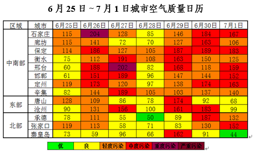 上周(2018625日~71日),受高温天气影响,全省空气质量以轻度至中度污染为主,25日和28日,受降水和北风影响,全省空气质量以良至轻度污染为主,首要污染物为O3。其中,石家庄(26日)和邢台(27日)各出现1O3重度污染。
