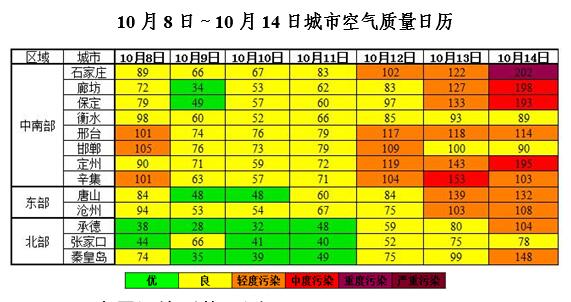 上周(2018108日~1014日),811日,受冷空气影响,扩散条件总体较好,全省空气质量以优良为主;1214日,受静稳天气影响,扩散条件较为不利,北部空气质量以良为主,中南部地区空气质量以轻至中度污染为主,其中,14日石家庄出现重度污染