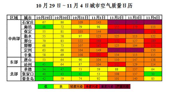 上周(2018年10月29日~11月4日),周前期(10月29~30日)扩散条件总体较好,全省空气质量以优良为主,周后期(10月31日~11月4日)扩散条件持续不利,北部和东部地区空气质量以良至轻度污染为主,中南部地区空气质量以轻度至中度污染为主,其中石家庄市出现3天重度污染,保定和定州市各出现2天重度污染。
