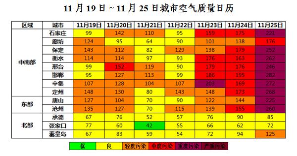 上周(20181119日~1125日),前期(2225日)扩散条件一般,全省空气质量以良至轻度污染为主,后期(2628,扩散条件较差,北部空气质量以良轻为主,中南部空气质量以中至重度污染为主