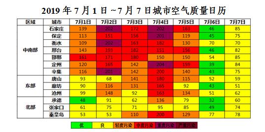 上周(2019年7月1日~7月7日),7月1~5日,地面温度较高,扩散条件整体一般,我省北部空气质量以良至轻度污染为主,中南部和东部空气质量以轻度至中度污染为主,其中,石家庄出现两天臭氧重度污染,保定、衡水、定州、辛集市各出现一天臭氧重度污染。6-7日,受北风和降水影响,温度降低,辐射强度减弱,我省大部地区空气质量以优良为主,首要污染物为O3