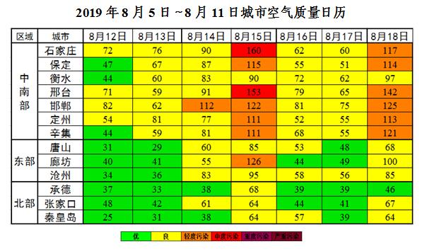 上周(2019812日~818,受区域性降水过程及北风影响,扩散条件总体有利,我省大部以优良为主;期间1518日,地面受南风影响,扩散条件一般,全省大部以良至轻度污染为主,首要污染物为O3。石家庄、邢台各出现1中度污染