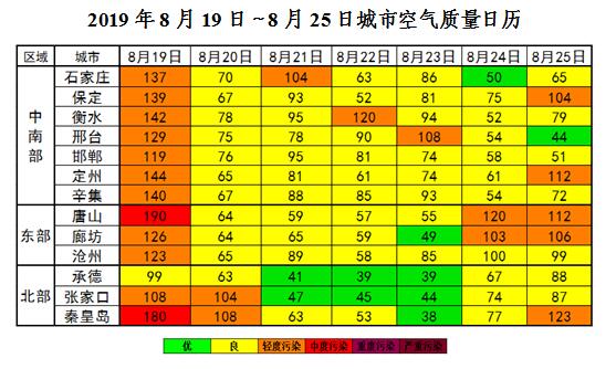 上周(2019年8月19日~8月25日),19~20日和25日,地面受南风影响,扩散条件一般,我省大部地区空气质量以良至轻度污染为主;21~24日,受区域性降水过程及北风影响,扩散条件总体有利,我省大部以优良为主,首要污染物主要为O3。唐山、秦皇岛各出现1天臭氧中度污染