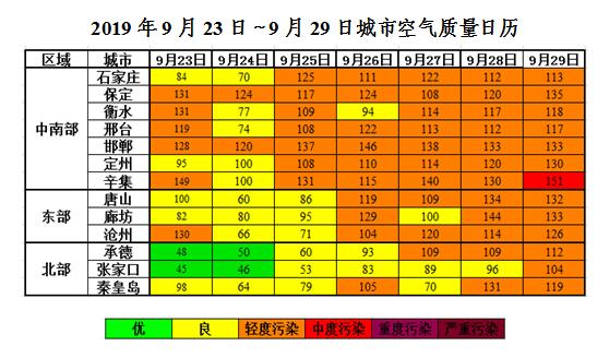 上周(2019年9月23日-9月29日), 大气扩散条件逐步转为不利,我省北部前期以优良为主,26-29日空气质量以良至轻度污染为主。南部和东部以良至轻度污染为主。其中,辛集市29日出现一天中度污染。首要污染物主要为O3和PM10。