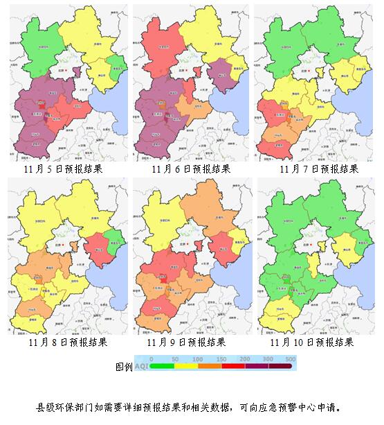 5~6日,我省北部扩散条件一般,空气质量以良至轻度污染为主,中南部地面以偏南风为主,有逆温,扩散条件不利,空气质量以中至重度污染为主,首要污染物为PM2.5。