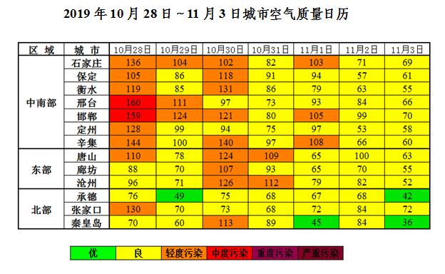 10月28~31日,受沙尘及其回流影响,我省空气质量以良至轻度污染为主,首要污染物主要为PM10,其中邢台、邯郸分别出现一天PM10中度污染。11月1~3日,我省空气质量以良为主。