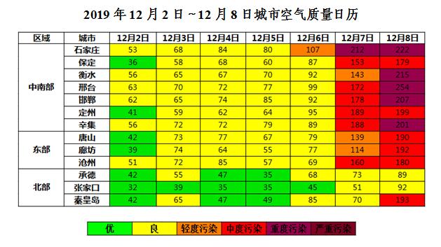 12月2日~6日,扩散条件较好,我省大部空气质量以优良为主。7日~8日,扩散条件较差,我省空气质量大部以中至重度污染为主,首要污染物主要为PM2.5,衡水、邢台、邯郸、辛集各出现一天重度污染,石家庄出现两天重度污染。