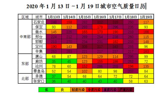 上周(2020年1月13日~1月19日),我省北部扩散条件较好,空气质量以优良为主;东部地区13~14日,扩散条件较好,空气质量以优良为主,15~18日,扩散条件逐渐转差,以中至重度污染为主,19日扩散条件转好,以良为主;中南部1月13~18日,扩散条件整体不利,以重度污染为主,19日扩散条件转好,以良至轻度污染为主。其中定州出现3天严重污染,石家庄出现2天严重污染,首要污染物以PM2.5为主。