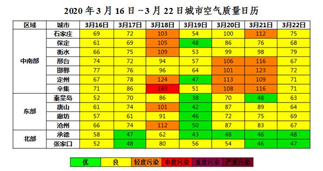 上周2020316日~32216~17扩散条件一般,我省大部空气质量以良为主18受沙尘天气影响,我省大部以良至轻度污染为主,辛集市出现1中度污染。19,受冷空气影响,扩散条件较好,我省大部空气质量优良。20~21受间歇性冷空气影响,我省大部以良至轻度污染为主。首要污染物为PM10O3