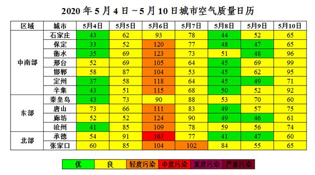 上周(5月4日~5月10日),受间歇性冷空气和区域性降水影响,我省大部空气质量以优良为主,首要污染物为PM10、PM2.5和O3;其中6日我省大部气温短暂大幅回升,我省大部出现O3轻度污染,承德出现中度污染。