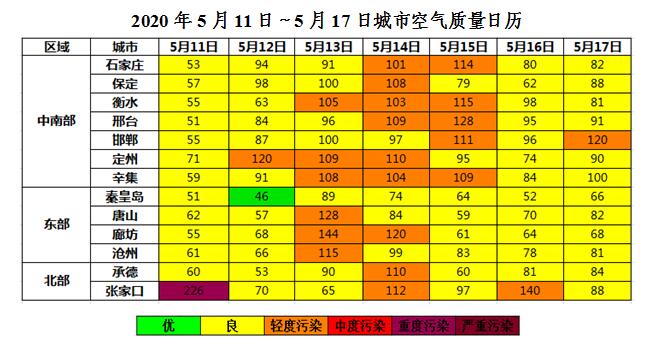 上周(5月11日~5月17日),我省扩散条件一般,个别城市受到沙尘、浮尘天气影响。我省大部空气质量以良至轻度污染为主,首要污染物为PM10、PM2.5和O3,其中张家口出现1天PM10重度污染。