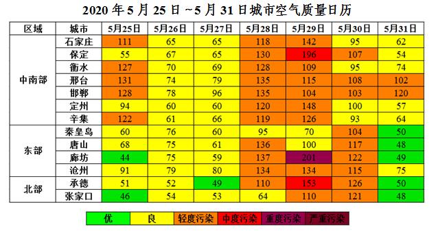 上周(5月25日~5月31日),25~27日、31日受冷空气和降水影响,扩散条件较好,我省北部和东部空气质量优良,中南部以良至轻度污染为主;28~30日,受南风影响,温度持续升高,我省大部空气质量以轻度污染为主,其中29日保定、承德达到中度污染,廊坊达到重度污染。首要污染物为O3。