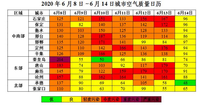 上周(6月8日~6月14日),8-13日,我省北部受冷空气和降水影响,扩散条件较好,空气质量以良至轻度污染为主,中南部和东部温度较高、相对湿度较低,空气质量以轻至中度污染为主,其中8日秦皇岛达到重度污染,首要污染物为O3、PM10。14日,受冷空气影响,我省大部空气质量以优良为主,首要污染物为O3。