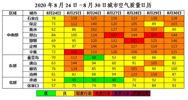 上周(8月24日~8月30日),24日,受降水影响,温度较低,我省空气质量以良为主,首要污染物为O3。25-30日,温度回升,云量较少,我省北部空气质量优良,中南部及东部空气质量以良至轻度污染为主,其中邢台于27日和29日出现两天中度污染,辛集和邯郸分别于25日和28日出现一天中度污染,首要污染物为O3。