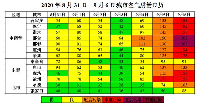 上周(8月31日~9月6日),8月1日-9月4日,受降水及持续偏北风影响,扩散条件较好,空气质量以优良为主,首要污染物为O3和PM10。5-6日,温度回升,湿度较低,我省大部空气质量以轻至中度污染为主,其中6日邢台、邯郸达到重度污染,首要污染物为O3。