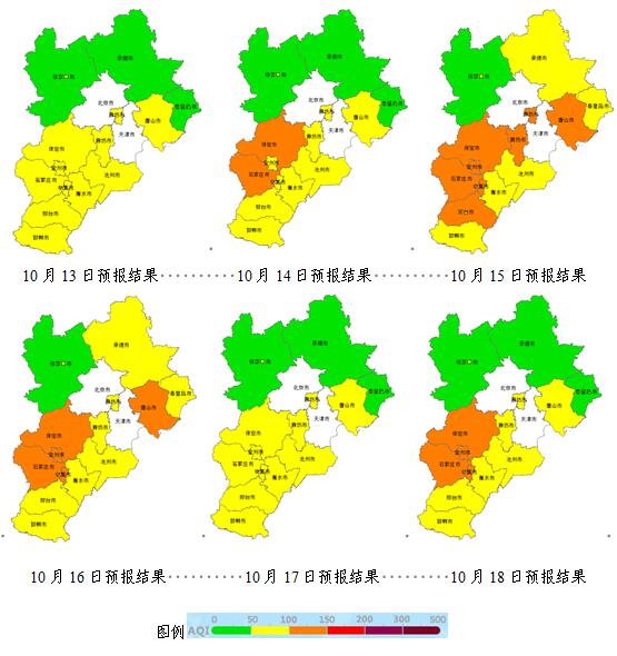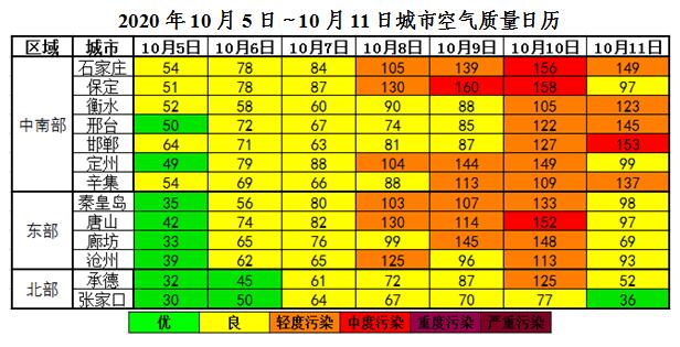 上周(10月5日~10月11日),5~7日,我省大部以优良为主,首要污染物为PM10和NO2;8~11日,地面以南风为主,扩散条件不利,污染物逐步积累,我省大部空气质量以良至轻度污染为主,个别城市出现中度污染,首要污染物为PM2.5。其中,保定出现2天中度污染,石家庄、邯郸、唐山各出现1天中度污染。