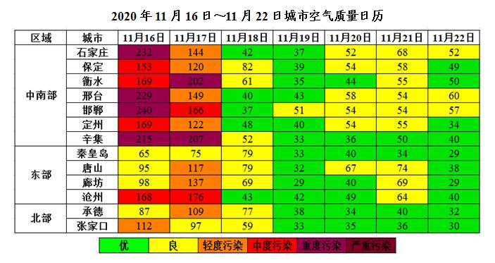 上周(11月16日~11月22日),16~17日,受弱南风影响,湿度较高,扩散条件较差,我省中南部以中至重度污染为主,北部和东部以轻至中度污染为主,首要污染物为PM2.5和NO2。18-22日,受降水和多股冷空气影响,扩散条件有利,我省大部空气质量以优良为主,首要污染物为NO2和PM10。