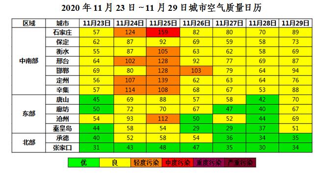 上周(11月23日~11月29日),整体扩散条件较好,我省大部空气质量以优良为主,首要污染物为PM10和PM2.5。其中24~25日,中南部湿度升高,扩散条件一般,污染物缓慢累积,空气质量以轻度污染为主,石家庄出现一天中度污染,首要污染物为PM2.5。