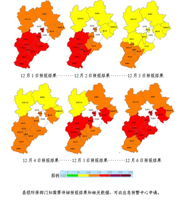12月1~2日上午,我省北部和秦皇岛、唐山扩散条件一般,空气质量以良至轻度污染为主。中南部地面风场较弱,湿度较高,扩散条件较不利,以轻至中度污染为主,保定、石家庄、衡水、邢台可能出现短时重度污染,首要污染物为PM2.5。