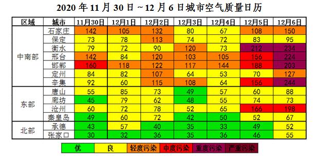 上周(11月30日~12月6日),北部扩散条件较好,空气质量优良;东部和中南部,前期11月30日~12月4日,整体扩散条件一般,空气质量以良至轻度污染为主,首要污染物为PM10和PM2.5。12月5~6日,湿度升高,扩散条件不利,污染物缓慢累积,石家庄、保定、唐山、廊坊以良至轻度污染为主,其它城市以中至重度污染为主,其中衡水出现2天,邢台、邯郸、辛集分别出现1天重度污染,首要污染物为PM2.5。