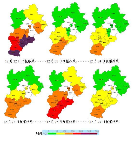 25日~27日上午,张家口、承德、秦皇岛受东北风影响,空气质量以优良为主;唐山、沧州、衡水、邢台、邯郸湿度较高,受逆温辐合影响,以轻至中度污染为主,26日夜间至27日上午受污染传输影响,可能出现短时重度污染;其他地区风力较小,扩散条件略差,空气质量以轻度污染为主,首要污染物为PM2.5。