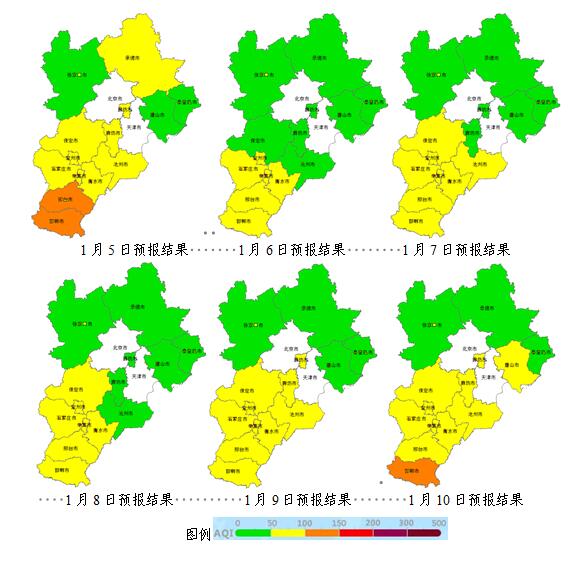 6日~10日,受多股冷空气影响,扩散条件较好,北部空气质量以优良为主,东部和中南部以良为主,首要污染物为PM2.5和PM10。