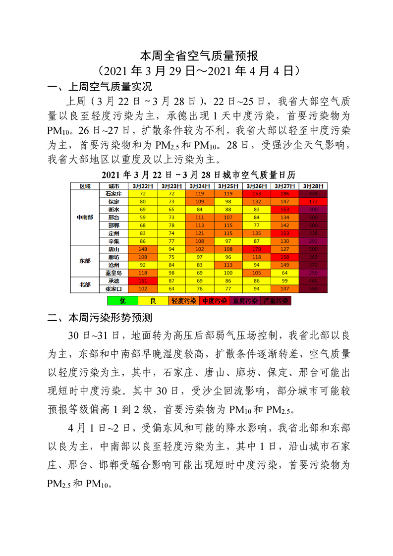 本周全省空气质量预报(2021年3月29日~2021年4月4日)