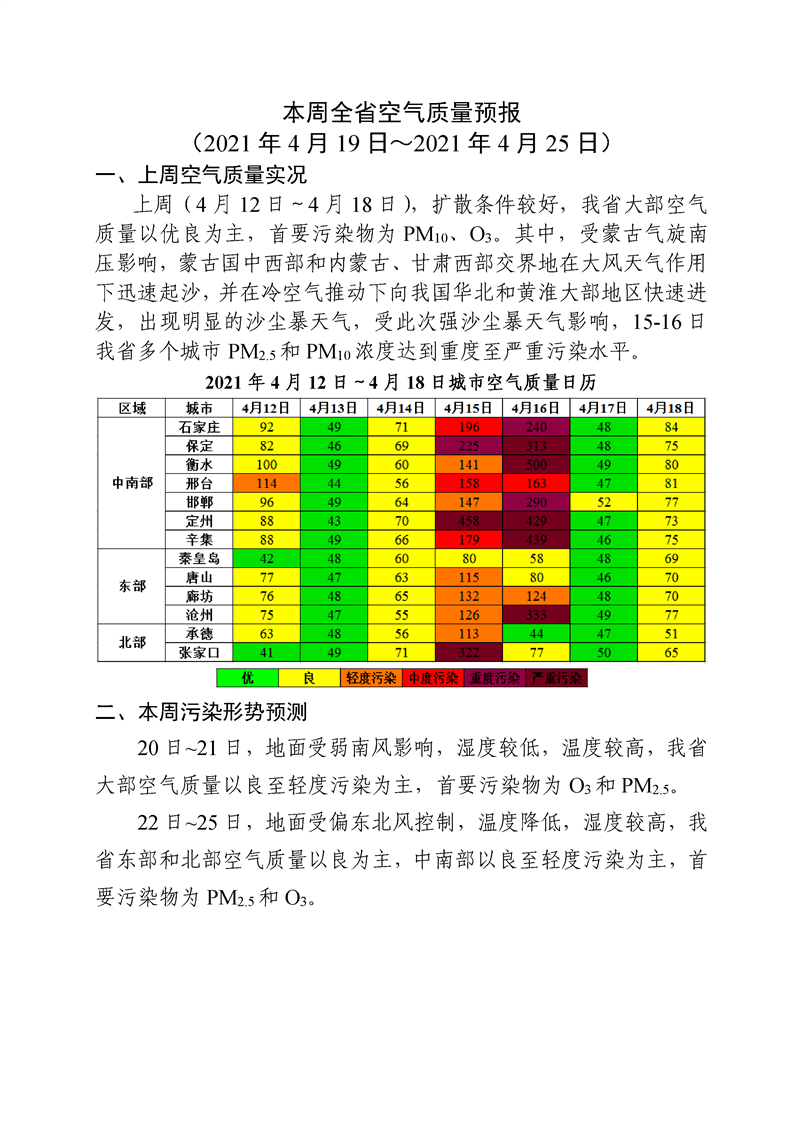 本周全省空气质量预报 (2021年4月19日~2021年4月25日)