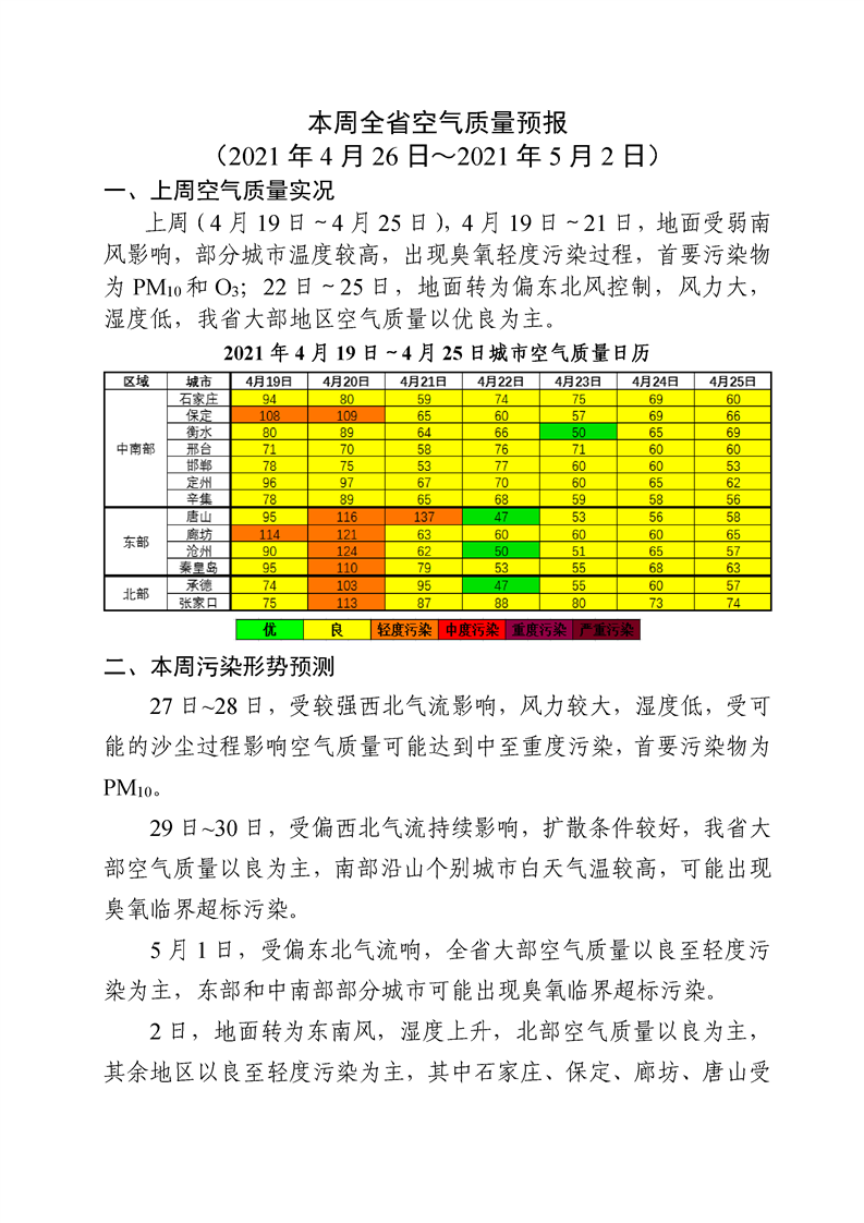 本周全省空气质量预报(2021年4月26日~2021年5月2日)