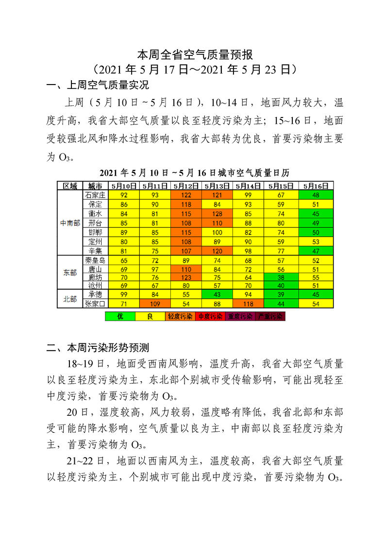 本周全省空气质量预报 (2021年5月17日~2021年5月23日)