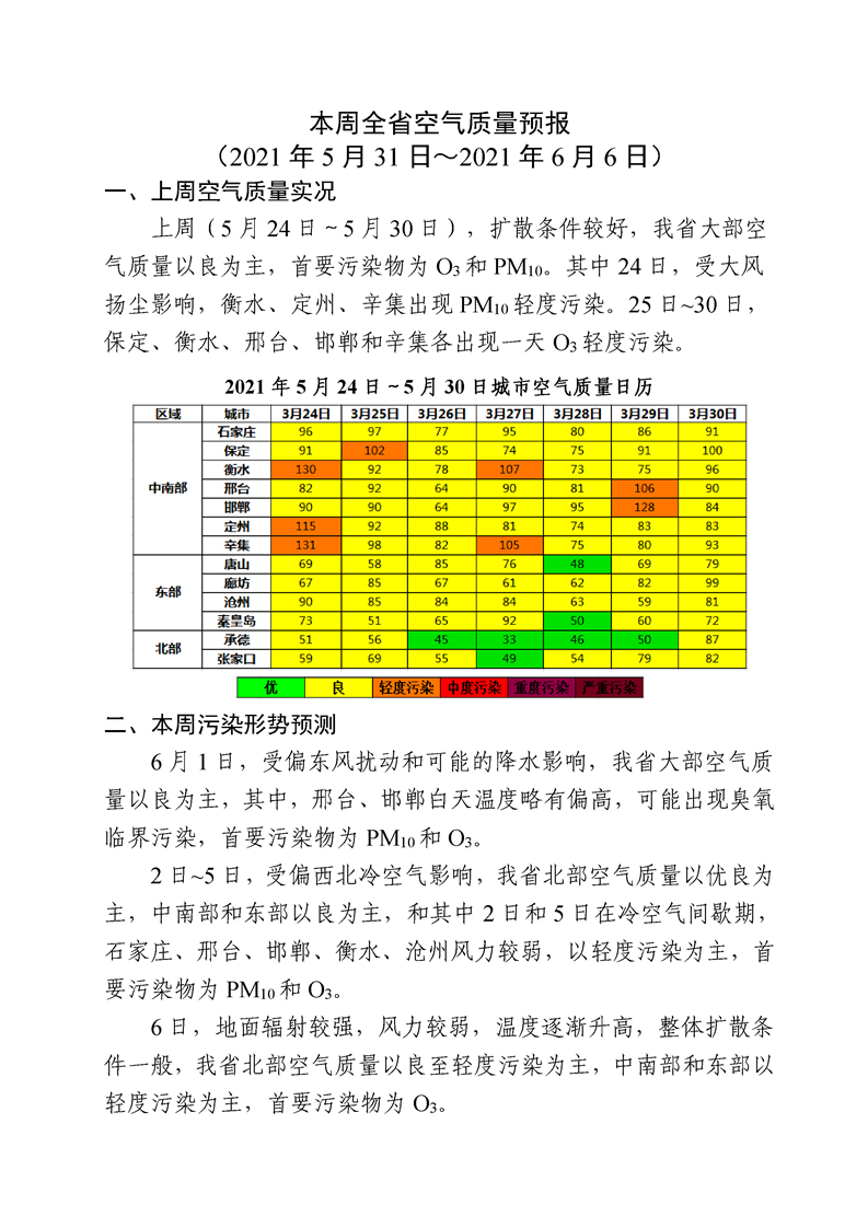 本周全省空气质量预报 (2021年5月24日~2021年5月30日)