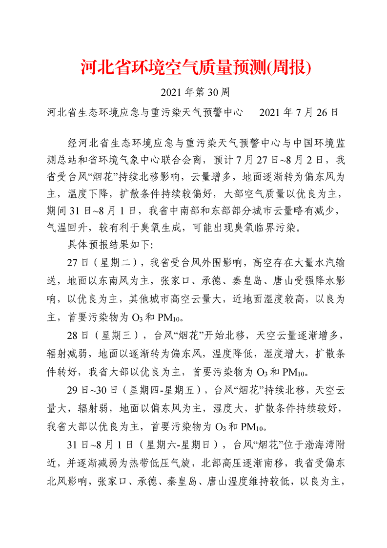 河北省环境空气质量预测周报2021年第30周