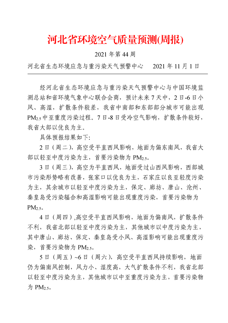 河北省环境空气质量预测(周报)2021年第44周