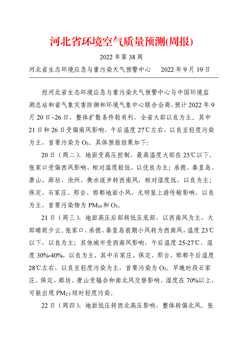 河北省环境空气质量预测周报2022年第38周