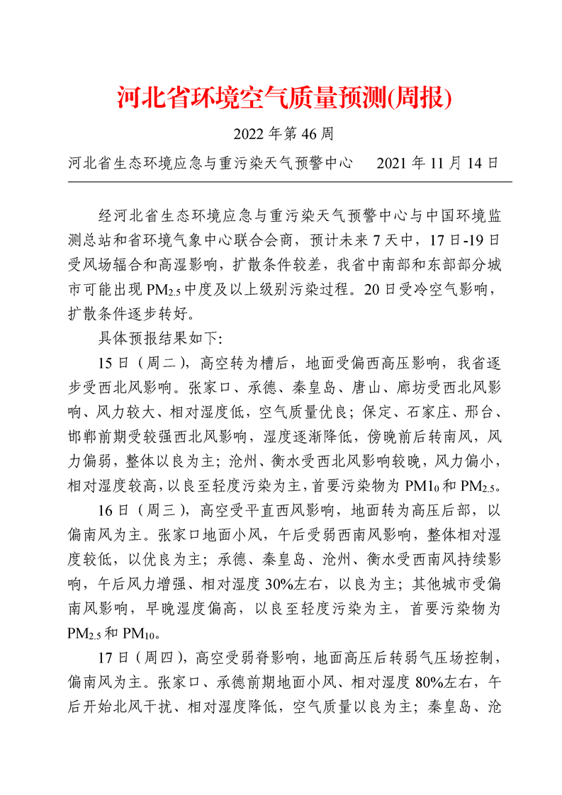 河北省环境空气质量预测周报2022年第46周