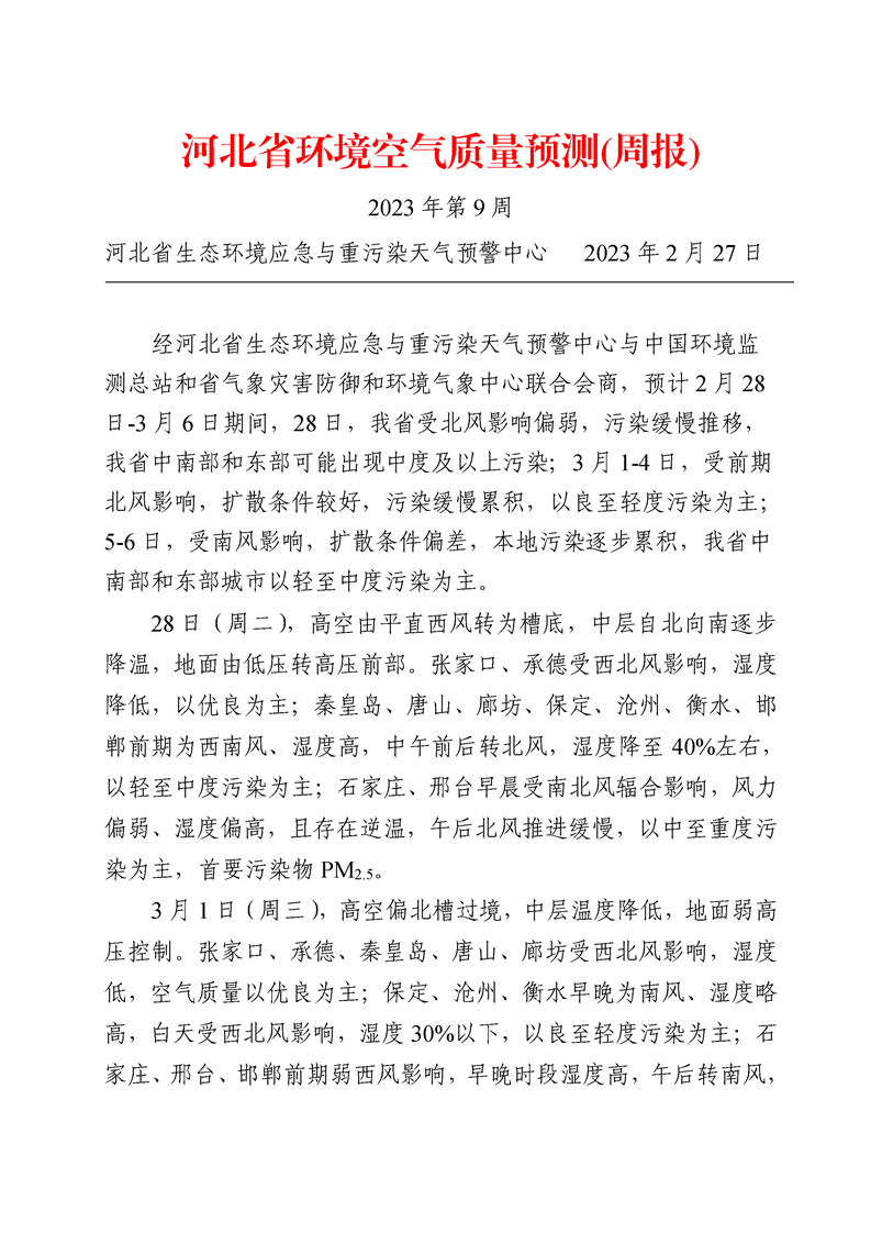 河北省空气质量预测报告(周报)2023年第9周