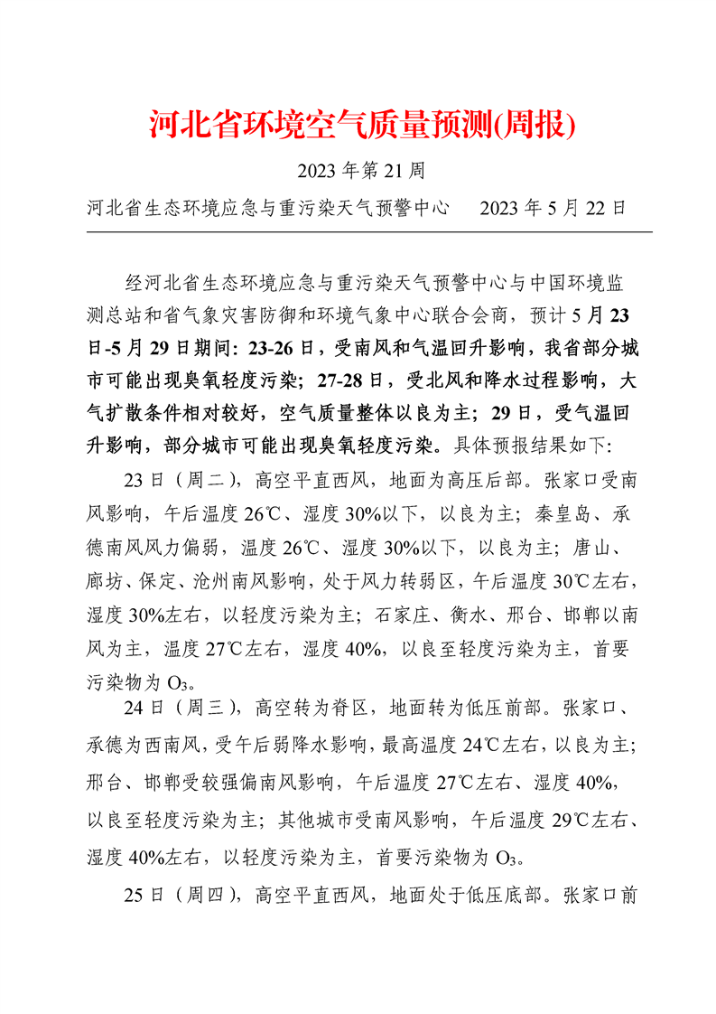 河北省空气质量预测报告(周报)2023年第21周