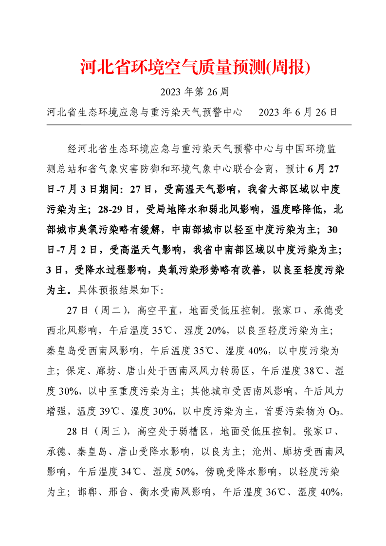 河北省空气质量预测报告周报2023年第26周