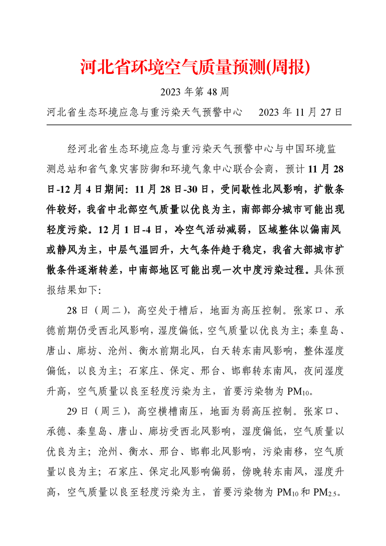 河北省空气质量预测报告(周报)2023年第48周