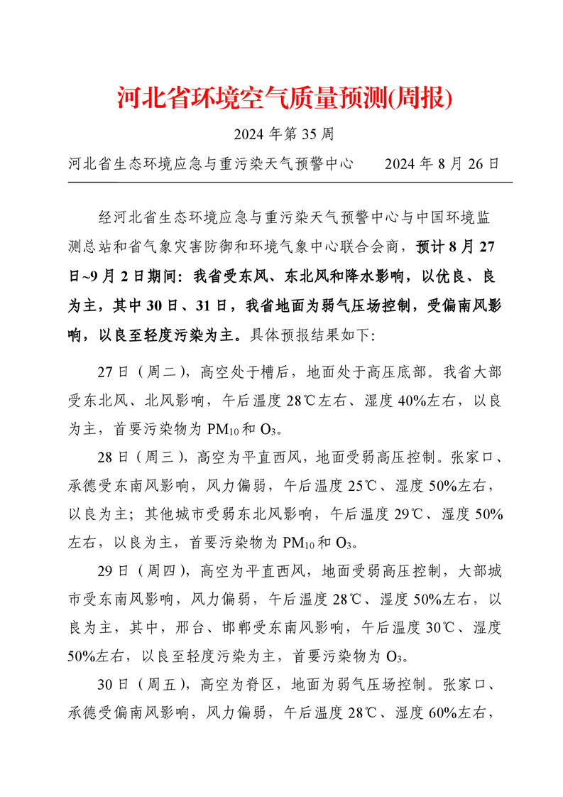 河北省空气质量预测报告周报2024年第35周
