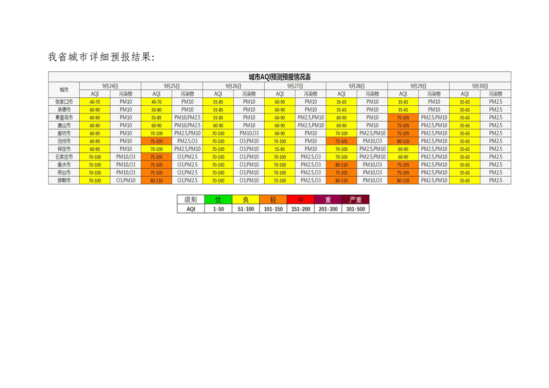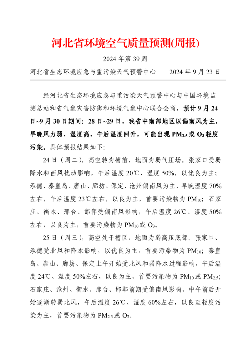 河北省空气质量预测报告周报2024年第39周