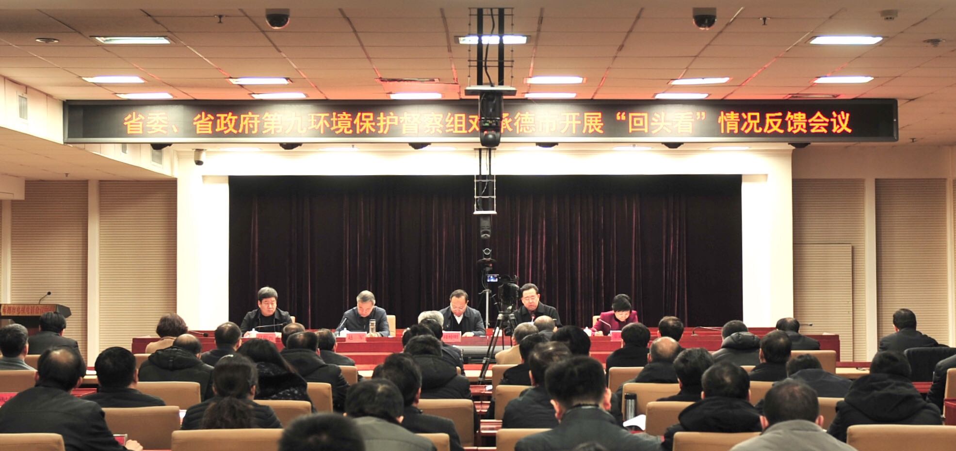 为贯彻落实党中央、国务院关于环境保护督察的重要决策部署,省委、省政府统一安排,2018年10月15日至11月5日,省委、省政府第九环境保护督察组(以下简称督察组)对承德市中央和省委、省政府环境保护督察整改落实情况开展“回头看”,并同步进行了水污染防治专项督察。按照全省统一安排部署和《河北省环境保护督察实施方案(试行)》要求,2019年1月5日,督察组召开会议,向承德市进行“回头看”情况反馈。省人大常委会副主任、承德市委书记周仲明,省委省政府第九环境保护督察组组长王金品、副组长赵军和赵振兴出席会议。承德市委副书记、市长常丽虹主持会议。承德市政协主席刘文勤、市委副书记安国富出席会议,承德市委、市政府领导班子成员及有关部门负责同志参加会议。
