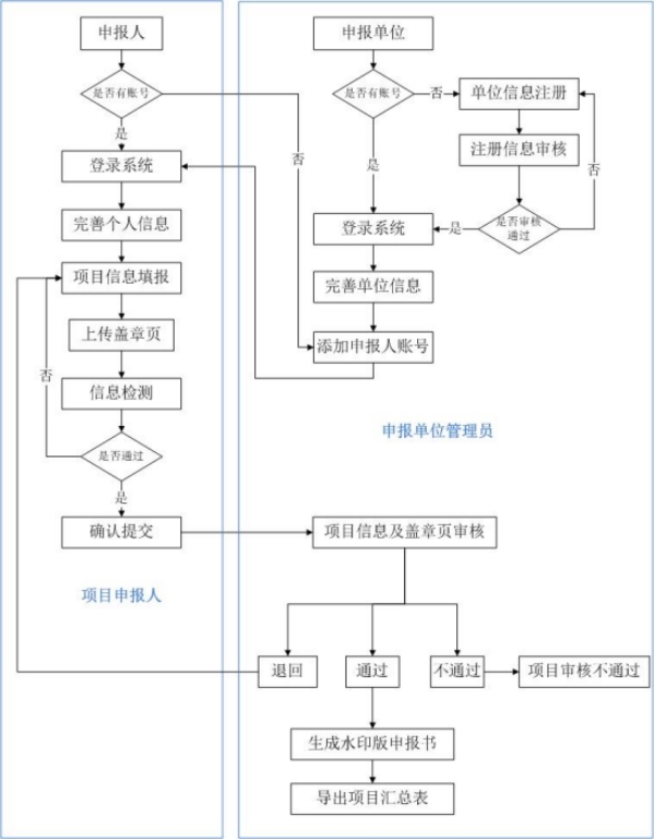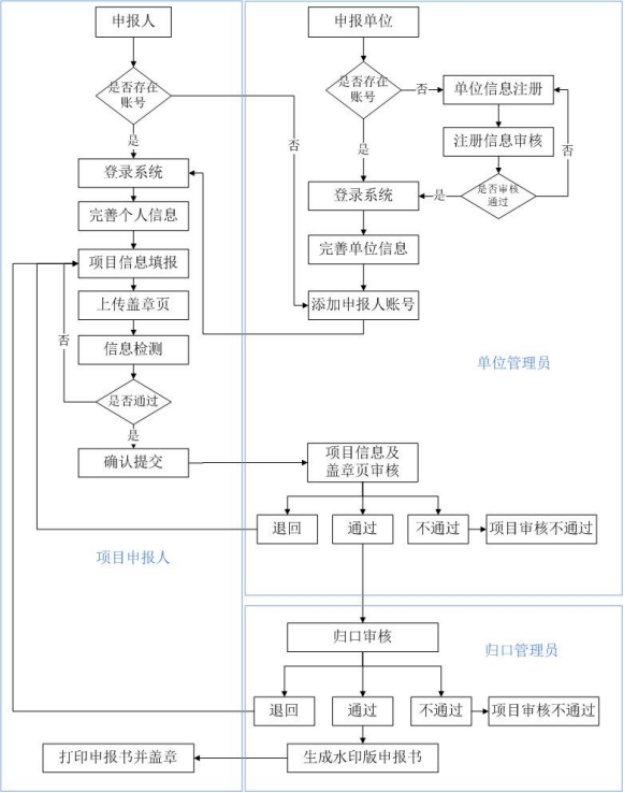 申报单位登录系统后对项目信息及盖章页进行审核,审核通过后自动推送至归口管理部门审核。