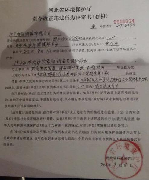 责令改正违法行为决定书(河北荣信钢铁有限公司)