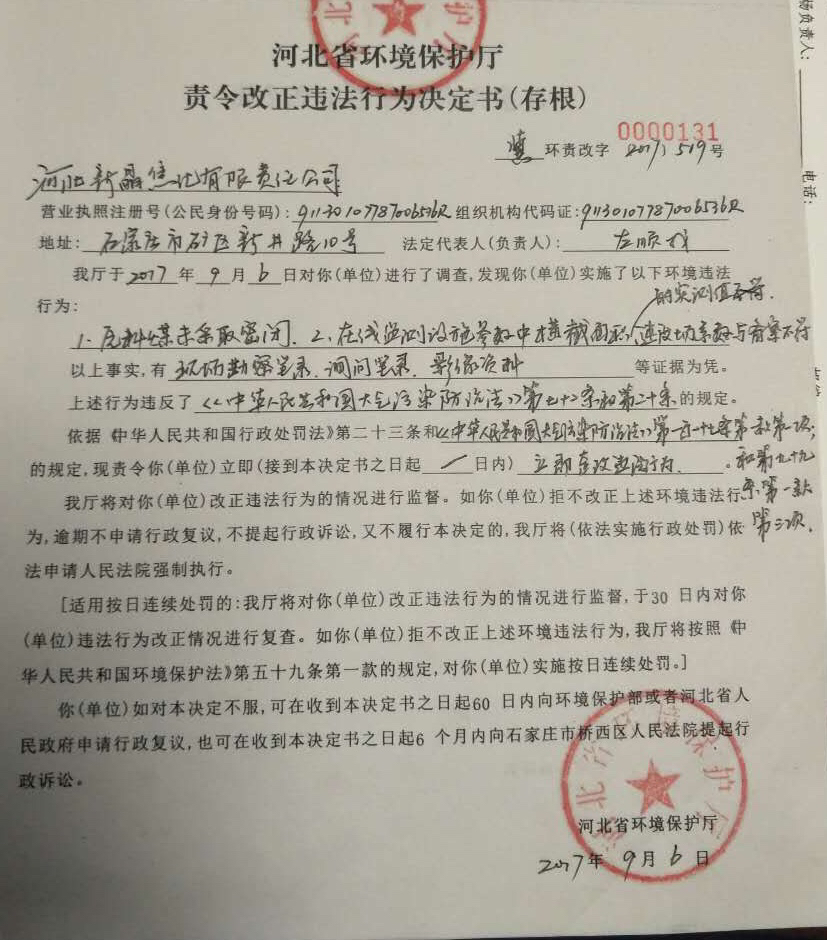 责令改正违法行为决定书(河北新晶焦化有限责任公司)