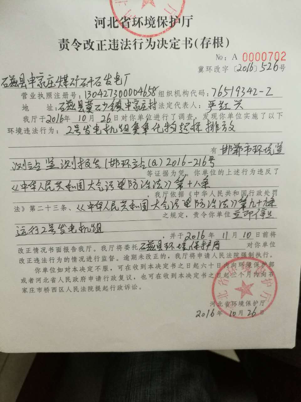 责令改正违法行为决定书(磁县申家庄煤矿矸石发电厂)