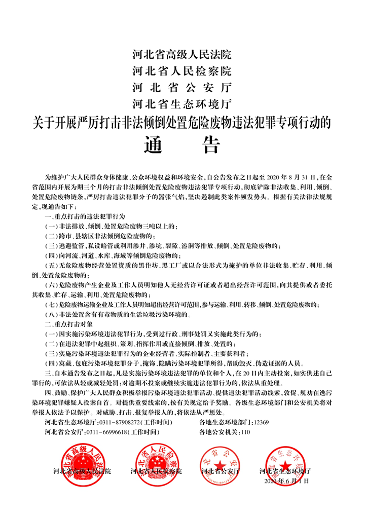 河北省高级人民法院 河北省人民检察院 河北省公安厅 杏彩(中国)官方网站 关于开展严厉打击非法倾倒处置危险废物 违法犯罪专项行动的通告