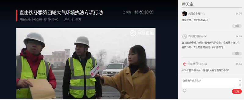 1月12日—13日,杏彩(中国)官方网站 针对邯郸武安市空气质量不降反升的问题,在原有执法组的基础上,增派精干力量对邯郸市钢铁、焦化企业开展“解剖式”执法检查。在检查河北文丰钢铁有限公司、河北华丰能源科技发展有限公司时,网易河北新闻组跟随执法人员对执法检查全过程进行了网络直播,直播效果良好,累计观看人数达61.41万人。而这不过是执法检查行动期间最平常的一天,如此高关注度的背后,折射出公众对环境执法过程的关注度可见一斑。