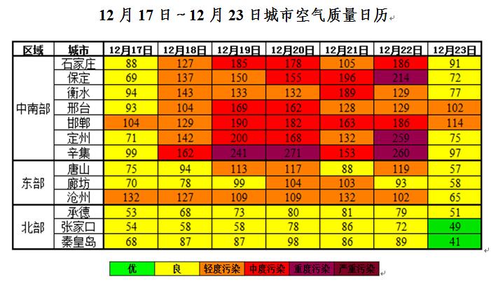 上周(2018年12月17日~12月23日),北部和东部扩散条件有利,空气质量以良至轻度为主。中南部,17~18日扩散条件一般,以良至轻度污染为主;19~22日扩散条件逐步转差,以轻度至中度污染为主,部分城市出现重度污染;23日,受冷空气影响,扩散条件改善,以良至轻度污染为主。